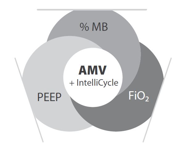 - • AMV (адаптивная минутная вентиляция) автоматически регулирует параметры вентиляции в зависимости от состояния пациента