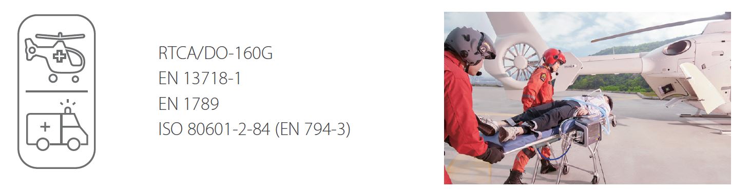 Аппарат соответствует различным стандартам для транспортных средств, таких как вертолеты и машины скорой помощи, и поддерживает различные виды транспорта.