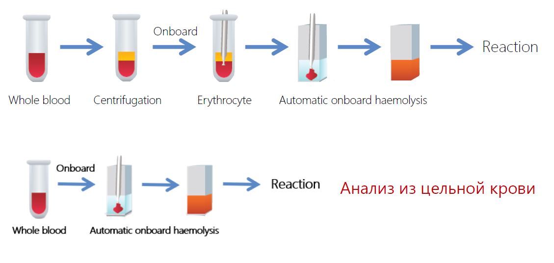 Загрузка образца цельной крови, автоматический гемолиз на борту