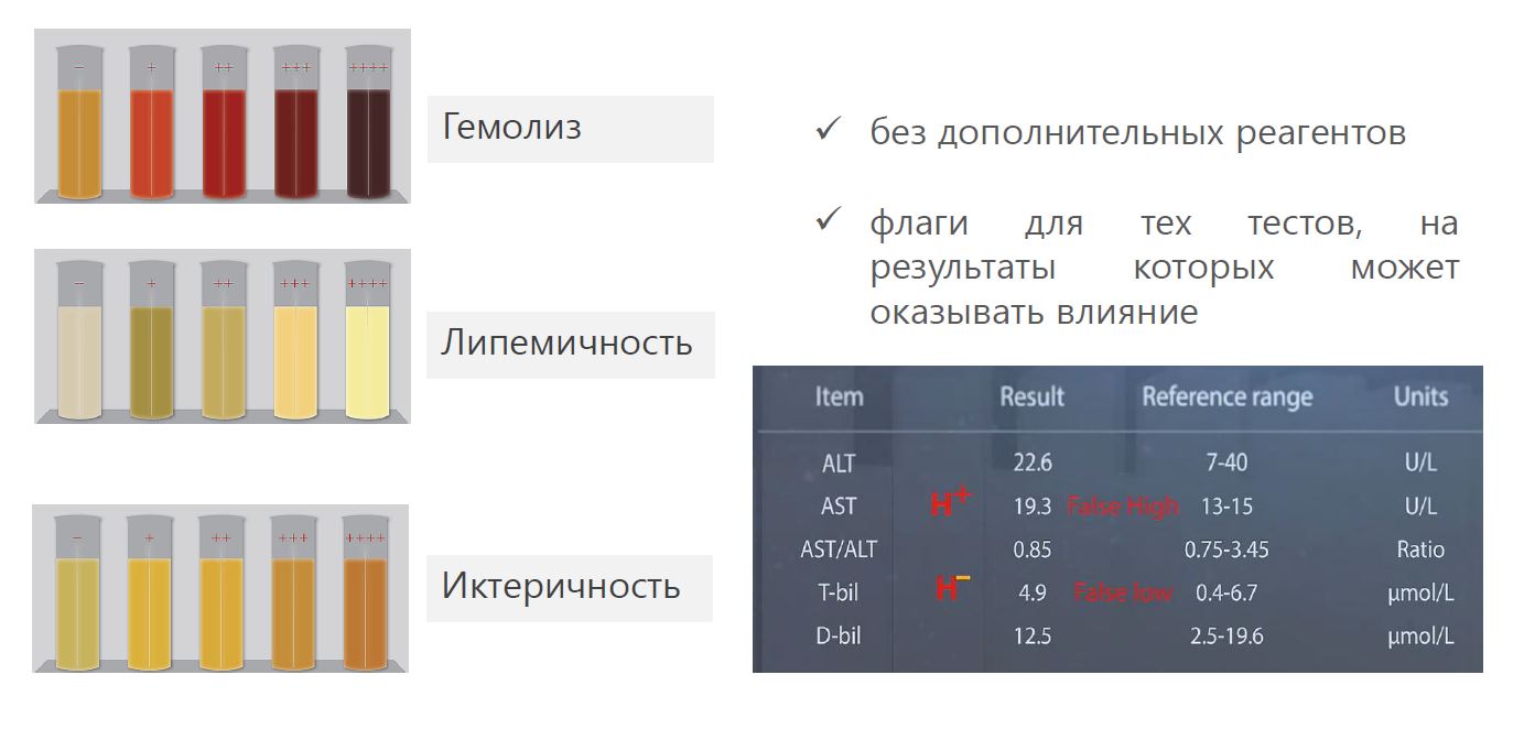 • Автоматическое определение сывороточных индексов без снижения производительности • Флаги для тестов, на которые есть влияние • Флаги с указанием на ложное завышение/занижение результата