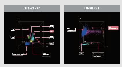 Технология трехмерного флуоресцентного анализа обеспечивает надежную дифференциацию незрелых и других патологических клеток, например, незрелых гранулоцитов (IMG), ретикулоцитов (RET*) и фракций незрелых тромбоцитов (IPF).
