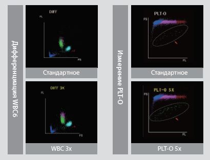 В платформах для трехмерного флуоресцентного анализа BC-700 и BC-720 предусмотрены режимы анализа с трехкратным подсчетом концентрации лейкоцитов и 5-кратным оптическим подсчетом концентрации тромбоцитов, обеспечивающие повышенную достоверность результатов для образцов с низкими концентрациями лейкоцитов и тромбоцитов. Кроме того, функция дезагрегации тромбоцитов позволяет сократить трудоемкую аналитическую работу.