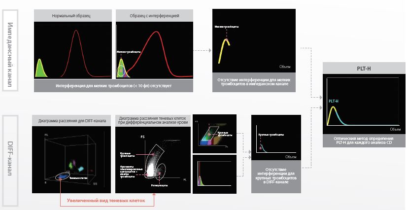 Для решения указанной выше проблемы мы разработали совершенно новый параметр PLT-H. Он объединяет в себе стандартный импедансный метод для определения мелких тромбоцитов и оптический метод для определения крупных тромбоцитов. Эта технология не подвержена интерференциям стандартного обнаружения тромбоцитов и не требует использования дополнительных реагентов.