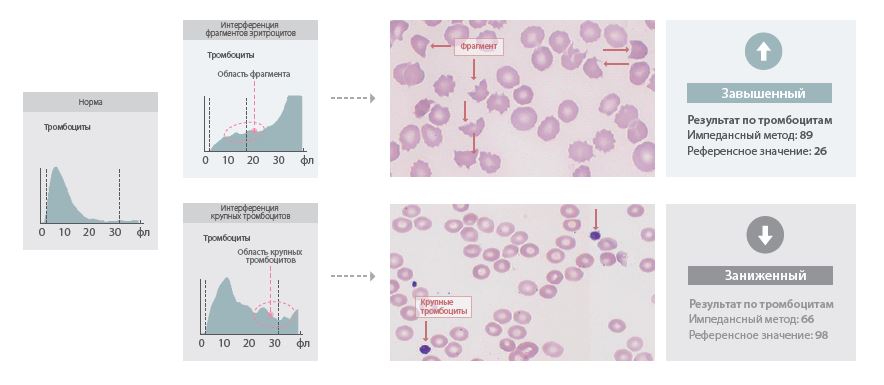 В стандартном импедансном методе тромбоциты подвержены воздействию интерференций, что может привести к получению завышенных или заниженных результатов (как показано на иллюстрации). Полученные неверные результаты напрямую влияют на суждение клиницистов и принимаемые ими решения. Результаты, получаемые на уровне клинических решений, связаны с безопасностью пациента. Поэтому получение точных результатов определения тромбоцитов чрезвычайно важно для клинической практики.