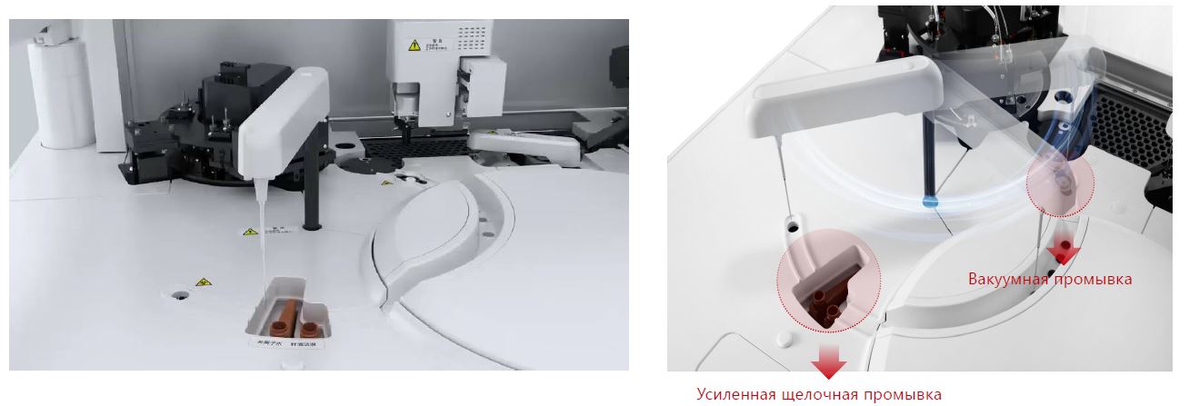 Ультразвуковая промывка дозатора проб на борту анализатора эффективно удаляет микросгустки и остатки разделительного геля