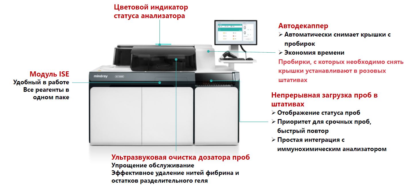 ✓ Анализ из одной пробирки: Биохимические (фотометрические тесты, ISE, HbA1c) и иммунохимические тесты. Удобная загрузка в штативах