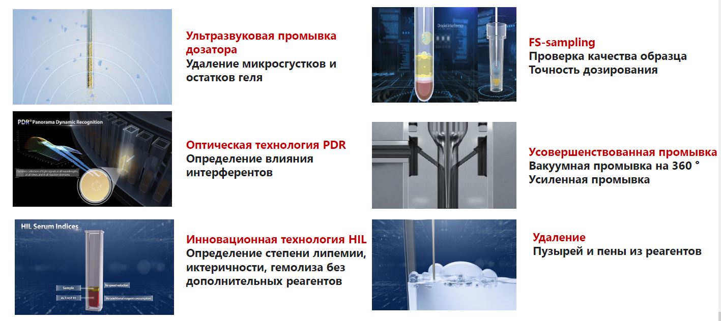 ✓ Технология FS-sampling (Определение пленок жидкости, пузырей, сгустков, уровня жидкости; повышение точности дозирования образца; Определение типа пробирок на основании базы данных)