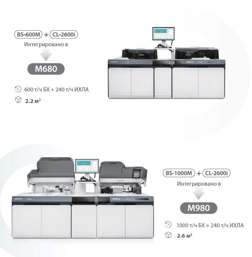 • Возможность компактной интеграции с биохимическим анализатором Mindray BS-1000M с образованием системы M980
